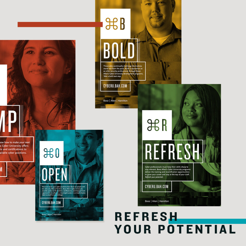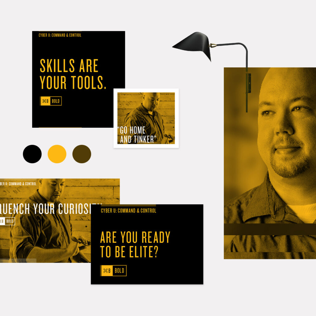 Nationwide, there are more cyber positions open than there are people with the relevant skills to fill them. My team's challenge was to design an actionable brand and recruitment marketing campaign that would raise awareness, amplify excitement, and increase engagement with the client's Cyber University, thus expanding the talent pool and increasing the number of accredited and certified cyber employees. I led the discovery, persona development, campaign strategy, and content design, development, and production for this project. “Command & Control” was an integrated campaign that gave employees the codes to find resources that open new opportunities and refresh their career paths through simple, but powerful actions and shortcuts.