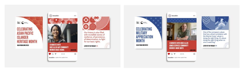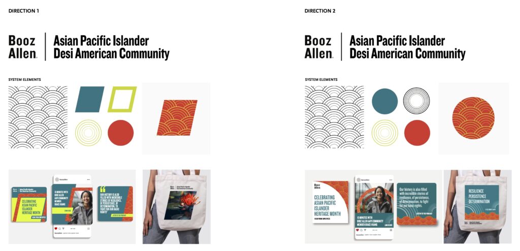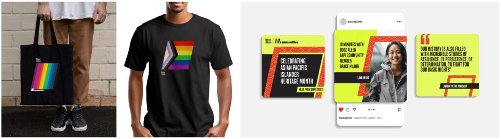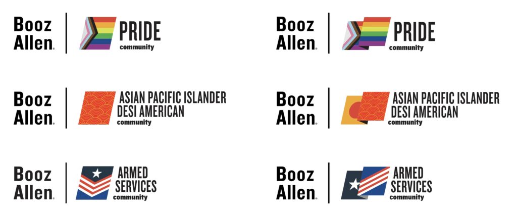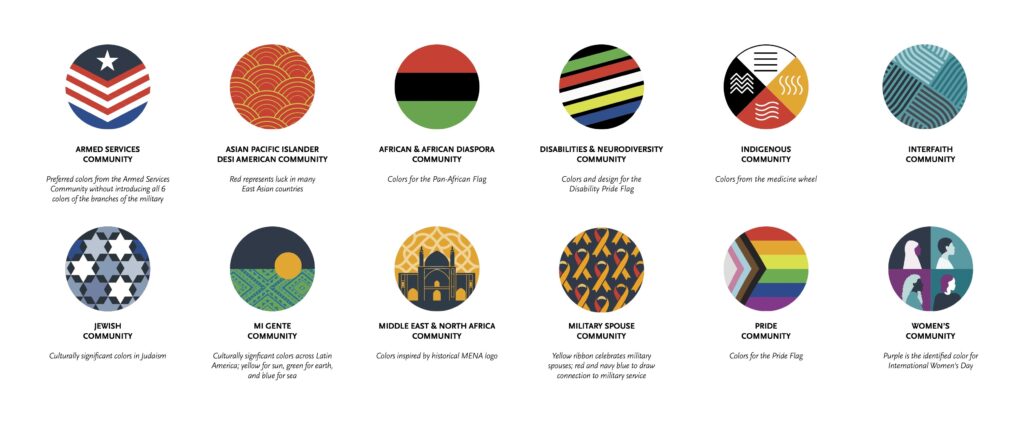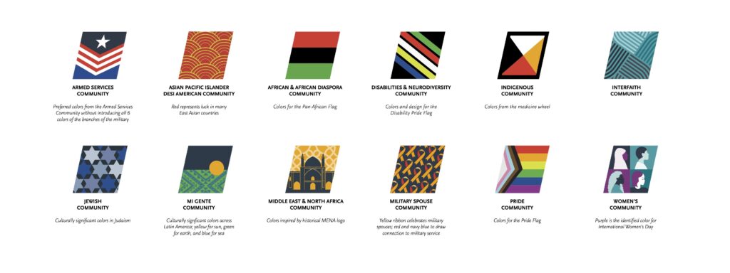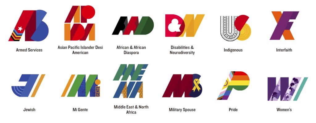 As the client's Business Resource portfolio evolves from a hierarchical system with branching networks into a flatter, more equitable and equal Employee Community portfolio, the needs for this collective identity system shifted with the strategy. These changes would go beyond simply cosmetic, but are integral to the way employees think about and engage with the community. Initially, this creative challenge was given by the client to an external agency to solve, but after months of work, it was clear that their work neither connected to the existing employer brand systems nor was scalable. So the client's senior leaders turned to my team to turn around the project, and ensure greater alignment was achieved with existing master, employer, culture, and TXG brand systems, and greater parity across the 12 new employee groups—while making certain that each population felt their distinct identities recognized and demonstrated. What follows are two approved design explorations that are now in development for style guidance and activation.